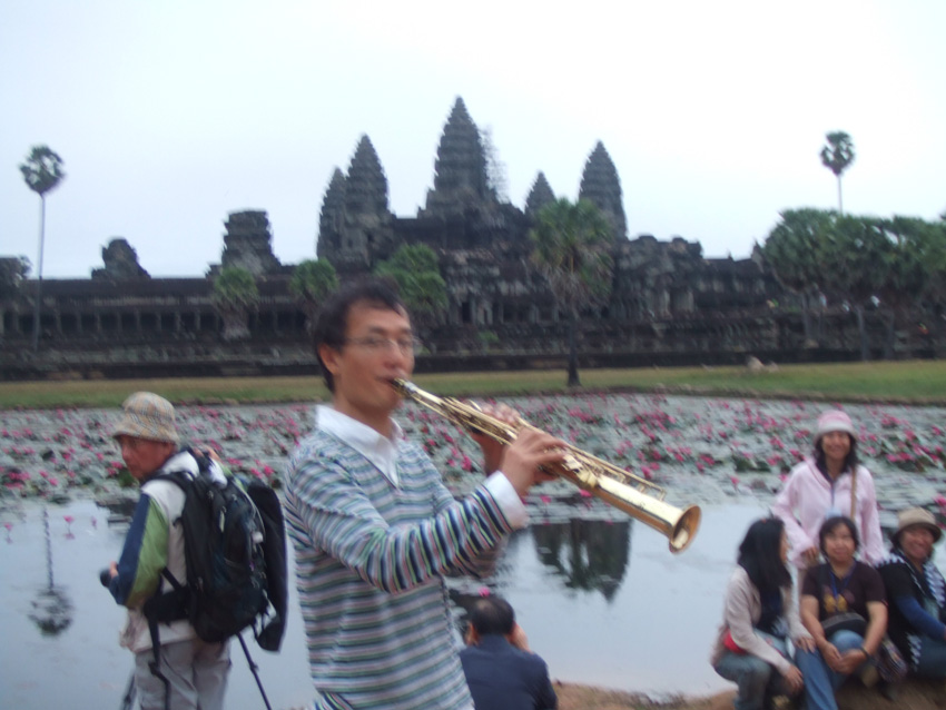 残念ながら、雲が多くてお日様は拝めなかった。代わりに、私が警備員の目を盗んで、「夜明けの歌」を演奏しました。アンコールワット全体(ちょっとオーバー)から拍手を頂きました。
