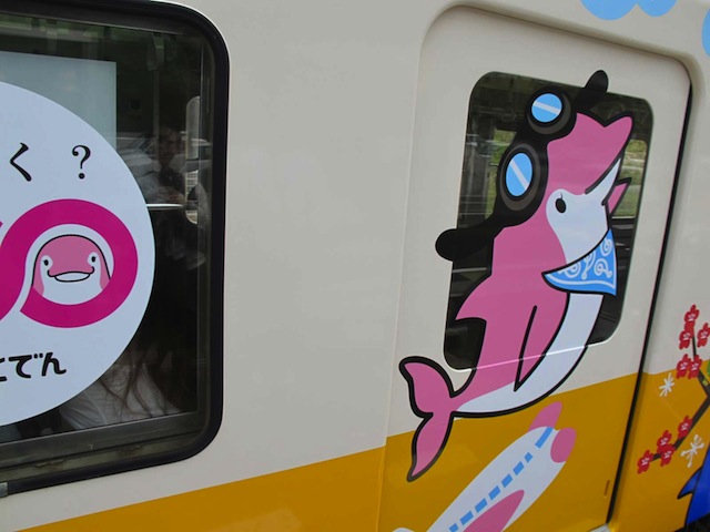 電車の中にはマスコットの巨大なぬいぐるみも。ことちゃんと、琴美ちゃん?!